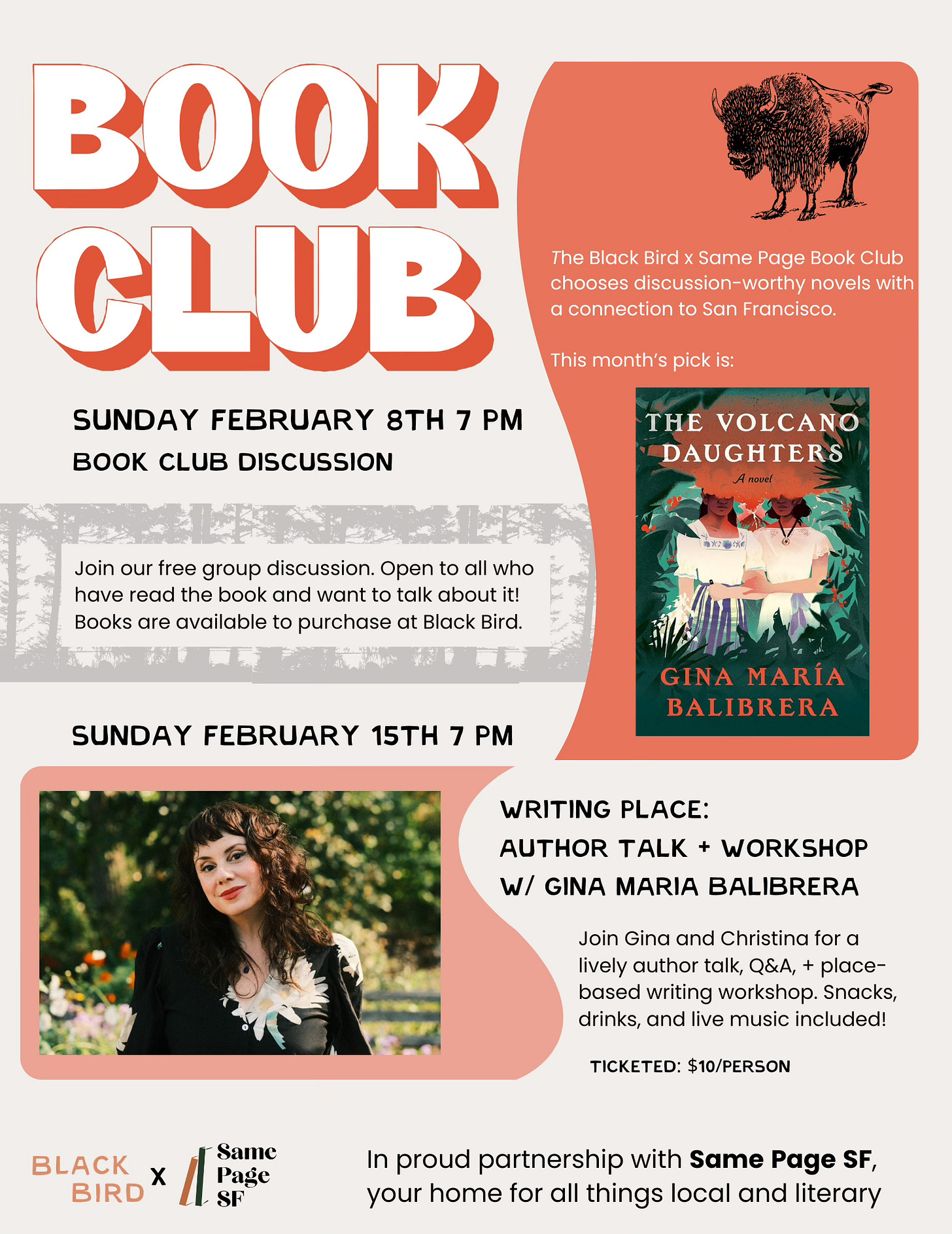 The Same Page x Black Bird Book Club is back! Our upcoming selection is The Volcano Daughters by Gina María Balibrera, “an epic story, a remarkable achievement” (NYT) about two sisters from El Salvador and their flight from genocide. We’ll meet to discuss this Sunday Feb 8th (7-8pm, free with RSVP). This apparently conflicts with the Super Bowl. Alas. (If it helps entice you away from the TV, three attendees will be randomly chosen to win a free early copy of our April selection!)