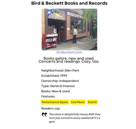 Speaking of our city’s dazzling array of bookstores, I’m working on two projects to catalogue them. Slowly but surely, I’m building an interactive digital guide with store profiles containing their own content and Same Page reader insights - something like: