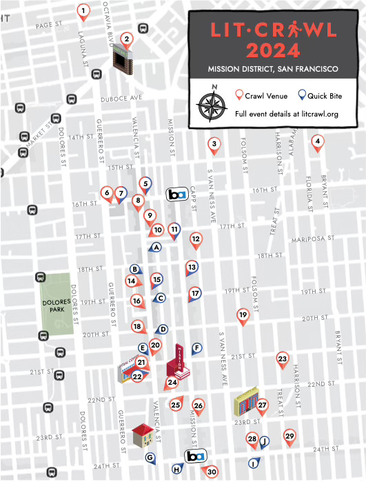 Lit Crawl is a massive, one-night-only, free literary pub crawl through the Mission District that brings together hundreds of authors and thousands of readers. If youâve never been, donât be intimidated - the vibes are immaculate (friendly, weird, fun). Iâve met some wonderful people through Litquake - đ book group - especially Lit Crawl!